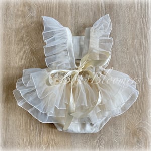 •Scalloped fringe fabric with gold sequins on the bodice that is complimented with full tulle lace skirt and crochet flower trim.