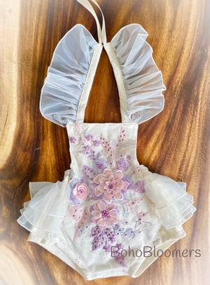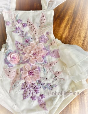 Made with a linen blend fabric in cream. Beautiful pastel purple flowers, with beads and pastel pinks and purples.